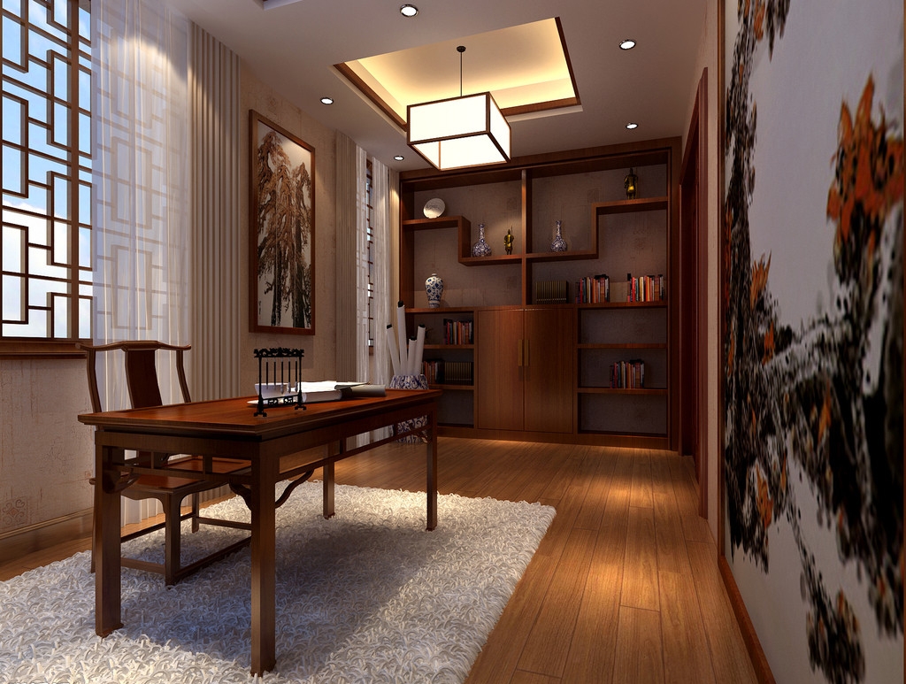 中式風格的書房,符合典雅、樸實、具有傳統意義上的“書齋”的韻味。“斯是陋室,唯吾獨馨”就是中式風格書房的完美演繹。紅色仿木紋樣式的吊頂,置入中式家具,加上中式書柜、茶幾及屏風,配以中國字畫和古玩等點綴其間,就構成一幅中式風格的書房藍圖。進入這個書房學習,你是不是也會有種穿越的感覺。