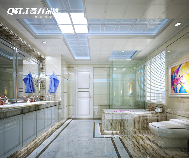 吊頂?shù)纳什灰颂^(guò)濃重,反而會(huì)讓人覺(jué)得壓抑。盡量以淺色為主,如米黃色、象牙白色。另外,衛(wèi)浴空間建議多采用鏡面及玻璃,可產(chǎn)生一種空曠感。