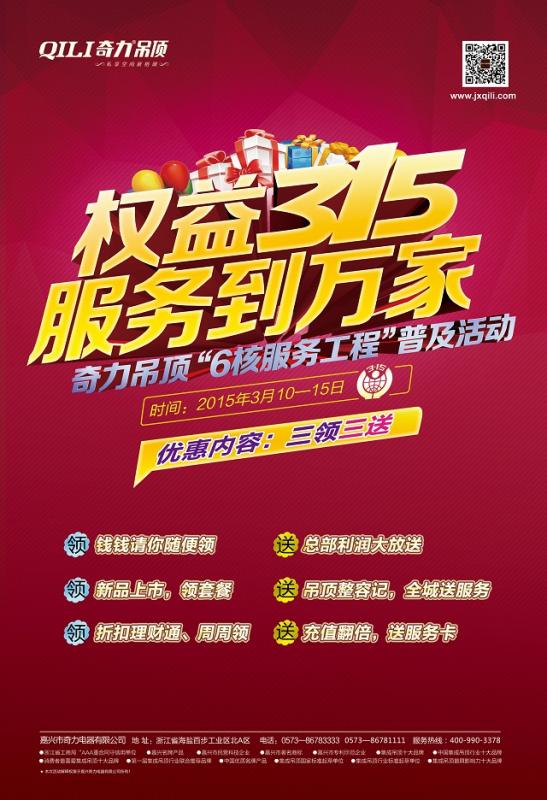 2015年3月15日,奇力吊頂,集成吊頂行業客廳吊頂領導者,暖風電器領導者,國家與行業標準起草單位,在消費者權益保護日這年度最重要的日子里,旗幟鮮明的推出了全國聯動的“權益315 ...